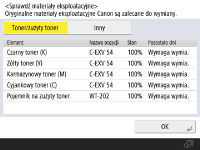 Nawet gdy w pozycji <Pozostało dni> wyświetlany jest status <Wymaga wymia.>, nie należy dokonywać wymiany, dopóki w obszarze wyświetlania statusu (na dole wyświetlacza panelu dotykowego) nie pojawi się komunikat mówiący o konieczności wymiany danego materiału eksploatacyjnego.