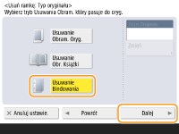 Naciśnij na <Usuwanie Obr. Książki> i sprawdź <Rozm.Oryginału>.