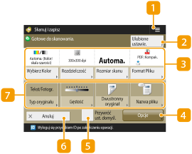 Wyświetla status ustawień, na przykład rozdzielczość i format skanowania. Upewnij się, że potwierdzono ustawienia, aby rozpocząć prawidłowy proces skanowania. Aby zmienić ustawienia, należy nacisnąć na przycisk znajdujący się pod wyświetlaną sekcją. Aby uzyskać informacje na temat formatów plików, patrz
