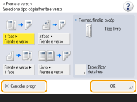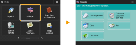 Ver o guia de funçõesCarregue em <Iniciação> para apresentar um ecrã que indica o que pode fazer com as funções da máquina, bem como dicas que explicam como utilizar operações de cópia, leitura, etc. Consulte este ecrã quando quiser mais informações sobre as funções disponíveis e como utilizá-las.