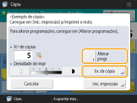 Carregue em <Alterar programações> para alterar as programações. <Ex. de cópia> é apresentado após a alteração das programações. Faça novamente a cópia de um exemplo.