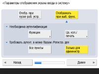 Выберите время для отображения экрана входа. Если вы выберете <Отображать при выб. функ.>, нажмите <Функции> и <Цв. коп./печать>, выберите функцию, для которой нужно отобразить экран входа в систему, и нажмите <OK>. Также выберите настройки на экране <Параметры/Регистрация>, для которых нужно отобразить экран входа в систему.