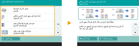 استعراض دليل الوظائفاضغط على <برنامج تعليمي> لعرض شاشة تُعرّفك بما يمكنك القيام به باستخدام وظائف الجهاز بالإضافة إلى إرشادات خاصة باستخدام النسخ والمسح الضوئي، إلخ. استعرض هذه الشاشة عندما ترغب في معرفة المزيد عن الوظائف المتوفرة وكيفية استخدامها.