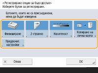 Регистриране в <Предпочитани настройки>В <Предпочитани настройки> можете да регистрирате често използвани процедури за копиране, както и често задавани дестинации и настройки за сканиране. За повече информация вижте Регистриране на комбинация от често използвани функции.
