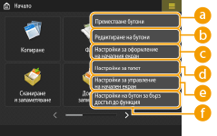В зависимост от настройката за <Разреши перс. на началния екран за обща употреба> и правата на влезлия потребител може да се покаже екран за избор на <Персонализир. за перс. употр.> или <Персонализ. за обща употр.>, когато се избере <Преместване бутони>, <Редактиране на бутони>, <Настройки за оформление на началния екран> или <Настройки за тапет>.