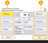 Можете да увеличавате или намалявате чрез задаване на съотношение на копиране (%). Можете да задавате поотделно вертикално и хоризонтално съотношение.