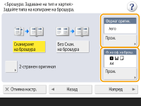 Натиснете <Промяна> в <Формат оригин.> и изберете формата на оригинала. Ако изберете <Авто>, форматът на брошурата автоматично се избира според формата на оригинала.