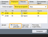 Не може да конфигурирате настройките за отчета за извършени дейности на факса, докато <Извеждане на регистър на задачите> в <Настройки за управление> е зададено да бъде <Изкл.>. В допълнение, ако промените <Извеждане на регистър на задачите> в <Настройки за управление> от <Изкл.> на <Вкл.>, <Отпеч./изпращ. за всеки зад. брой изпращ.> и <Отпечатв./изпращ. в зададен час> в отчета за извършени дейности на факса автоматично се променя на <Изкл.>. <Извеждане на регистър на задачите>