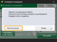 Когато <Извежд. съобщение, когато задачата е приета> е зададено на <Вкл.>, екранът <Сист. контрол> може да се изведе от следващия екран, който се показва след получаване на задача за изпращане. <Извежд. съобщение, когато задачата е приета>