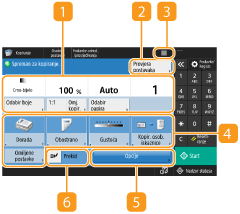 Prikazuje status postavke poput omjera kopiranja, veličine papira i broja kopija. Svakako potvrdite postavke kako biste pravilno kopirali. Da biste promijenili postavke, pritisnite gumb pod odlomkom zaslona.