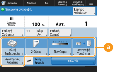 Μπορείτε να αλλάξετε τα πλήκτρα ρυθμίσεων που εμφανίζονται στις οθόνες βασικών λειτουργιών (για αντιγραφή, φαξ και σάρωση) με άλλα πλήκτρα ρυθμίσεων στο <Επιλογές>. Με τον εντοπισμό των συχνά χρησιμοποιούμενων πλήκτρων ρυθμίσεων στην οθόνη βασικών λειτουργιών, μπορείτε να χρησιμοποιήσετε τις λειτουργίες πιο αποτελεσματικά. Επιπλέον, πραγματοποιώντας σύνδεση με διαχείριση ατομικής πιστοποίησης, μπορείτε να εμφανίσετε μια διαφορετική οθόνη βασικών λειτουργιών, προσαρμοσμένη για κάθε χρήστη.