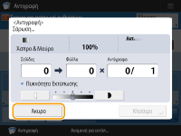 (Διακοπή) στον πίνακα ελέγχου ενώ εμφανίζεται η οθόνη βασικών λειτουργιών αντιγραφής, η εργασία αντιγραφής διακόπτεται και εμφανίζεται το μήνυμα <ΣτοπΕπιλέξτε εργασία αντιγραφής για ακύρωση.> καθώς και η λίστα εργασιών αντιγραφής. Μπορείτε να επιλέξετε την εργασία αντιγραφής από τη λίστα και να ακυρώσετε την εργασία πατώντας <Άκυρο>.Εάν συνδεθείτε με διαχείριση ατομικής πιστοποίησης και, στη συνέχεια, αποσυνδεθείτε αφού έχετε πατήσει το