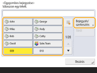 <Egygombos bejegyzése> lehetőséget válassza ki a bejegyezni kívánt egyérintéses gombot nyomja meg a <Bejegyzés/szerkesztés> <LDAP szerver> lehetőséget, és keresse meg a célhelyeket a <Keresés feltételekkel> lehetőség használatával. A célhely jóváhagyását követően nyomja meg az <Egygombos neve> lehetőséget adja meg a megjeleníteni kívánt egyérintéses nevet nyomja meg az <OK> gombot.Ha helyes a felhasználónév és a jelszó, de a keresés eredménye üres, ellenőrizze az idő beállítását az LDAP-szerveren és a készüléken. Ha az LDAP-szerver és a készülék közötti időbeállítás öt perccel vagy többel eltér, nem hajtható végre keresés.