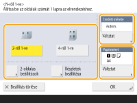 Ha szeretne 2-oldalas másolatokat készíteni, vagy szeretne 2-oldalas eredetik beolvasásával 1-oldalas másolatokat készíteni, nyomja meg a <2-oldalas beállítások> gombot. A beállítással kapcsolatban további információt a „2-oldalas másolás” című részben talál, az