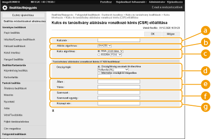 A készüléken előállított tanúsítványok nincsenek CA aláírással ellátva, ami egyes kommunikációs partnerek esetében kommunikációs hibákat okozhat. CA aláírással ellátott tanúsítvány igényléséhez tanúsítvány-aláírási kéréshez (CSR) kapcsolódó adatok szükségesek. CSR-t rendszergazdai jogosultságokkal bejelentkező felhasználók állíthatnak elő.