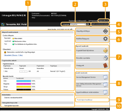 Ebben a részben a rendszergazda üzenetei és a készülék támogatásával kapcsolatos hivatkozások jelennek meg.