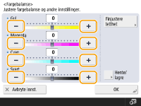 Du kan lagre opptil fire innstillinger etter justering. Etter å ha justert fargen, trykker du på <Hente/lagre>