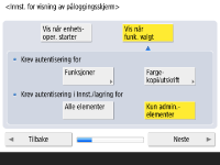 Trykk på <På> for <Bruk brukerautentisering>, trykk på <På> for påloggingsmetoden som skal brukes, og trykk på <Neste>.