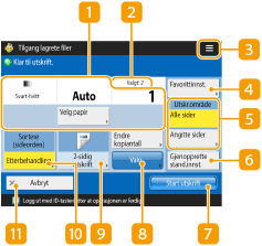 Når du trykker på <Tilgang lagrete filer> på <Hjem>-skjermen, og deretter trykker på <Nettverk> eller <Minnemedia> for å skrive ut filer, vises følgende innstillingsskjerm.