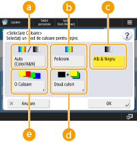 Puteţi să selectaţi un mod de culoare pentru copiere. De exemplu, acest lucru vă permite să economisiţi toner copiind documentele originale color în alb-negru sau copiind tichetele cu o singură culoare, cum ar fi roşu sau albastru pentru a indica data la care sunt distribuite.