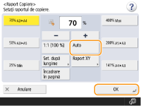 Dacă setaţi <Auto>, trebuie să selectaţi manual o dimensiune a hârtiei. Dacă nu selectaţi un format de hârtie, raportul de copiere este setat automat în funcţie de hârtia încărcată în sertarul 1.