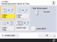 Dacă opţiunea <Selectare auto sursă hârtie> este setată la <Oprit> pentru o anumită sursă de hârtie, nu puteţi să faceţi copii pe hârtia încărcată în acea sursă de hârtie atunci când opţiunea <Selectare hârtie> este setată la <Auto>. <Selectare auto sursă hârtie>