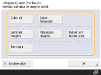 Puteţi să selectaţi mai multe tipuri pentru calitatea imaginii în acelaşi timp. Totuşi, opţiunile <Culori vii> şi <Culori temperate> nu pot fi selectate în acelaşi timp şi, de asemenea, opţiunile <Luminare imagine>, <Întunecare imagine> şi <Evidenţiere reproducere> nu pot fi selectate în acelaşi timp.