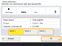 Puteţi să rechemaţi setările de copiere utilizate anterior. Detaliile setării rechemate pot fi modificate înaintea copierii.