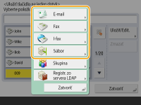 V záujme zvýšenia pohodlia je možné uložiť často používané miesto určenia do tlačidla na jeden dotyk. Vďaka tomu dokážete rýchlo špecifikovať miesto určenia jednoduchým stlačením tlačidla. Popri uložení čísla faxu alebo e-mailovej adresy do tlačidla na jeden dotyk môžete uložiť aj umiestnenie priečinka súborového servera (adresa IP a cesta) na použitie pri ukladaní naskenovaných údajov.