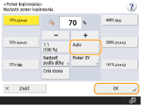 Ak nastavíte možnosť <Auto>, formát papiera budete musieť vybrať ručne. Ak nezvolíte formát papiera, nastaví sa pomer kopírovania automaticky tak, aby súhlasil s formátom papiera vloženého v zásuvke na papier 1.