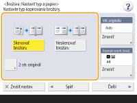 Stlačte tlačidlo <Zmeniť> v časti <Veľ. originálu> a vyberte formát originálu. Ak vyberiete možnosť <Auto>, formát brožúry sa vyberie automaticky podľa formátu originálu.