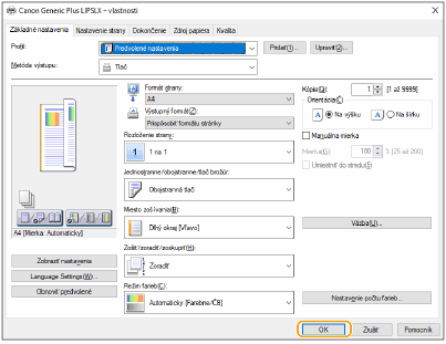 Podľa potreby prepnite karty a špecifikujte požadované nastavenia tlače.