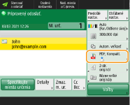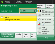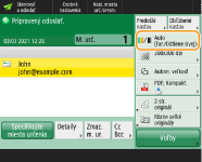 Formát: „rok, mesiac, deň, hodina, minúta a sekunda uloženia súboru (14-ciferné).prípona súboru“, napríklad „20151030133541.jpg“ Predmet e-mailuAutomaticky sa nastaví predmet zadaný v poli <Implicitný predmet> (<Implicitný predmet>). Ak chcete špecifikovať iný predmet, zmeňte dané nastavenie alebo ho špecifikujte zakaždým, keď odosielate e-mail (Špecifikovanie nastavení e-mailu).