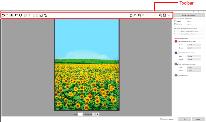 The inspection levels of the same type of inspection area on all of the pages are set to the levels specified here, regardless of the currently displayed page and the ranges of application of the areas that were set in Steps 6 and 7. If there are multiple inspection areas that are the same type in a single inspection job, different inspection levels cannot be set for each area. |