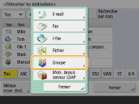 ![]() | Plusieurs destinataires enregistrés dans le carnet d'adresses (Enregistrement de destinataires dans le carnet d'adresses) peuvent être combinés en un groupe. Vous pouvez utiliser cette fonction pour envoyer des documents et des données de sauvegarde en même temps étant donné que plusieurs types de destinations peuvent être enregistrés dans le même groupe. Par exemple, vous pouvez enregistrer des adresses e-mail et des adresses IP de serveurs de fichiers dans un même groupe. |