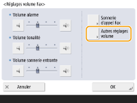 <Volume alarme>Réglez le volume du signal émis à l'annulation d'une transmission de fax ou à la fin de l'impression d'un fax réceptionné. Si vous ne voulez pas de signal sonore, appuyez sur