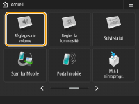 <Tonalité mode veille> | Signal sonore émis lorsque l'appareil passe en mode veille ou lorsque l'appareil est mis hors tension si vous définissez <Réglages démarr. rapide à la mise ss tension> sur <Oui>. (Selon les cas, l'appareil ne démarre pas rapidement et le signal sonore n'est pas émis.) |