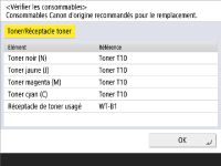 Il est recommandé de vérifier l'espace restant dans le réceptacle de toner usagé avant d'imprimer une grande tâche afin de déterminer s'il faut préparer un nouveau réceptacle de toner usagé ou pas.