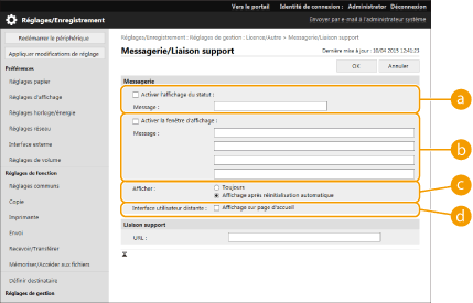 Pour faire apparaître le message dans la partie inférieure de l'afficheur tactile, cochez la case, puis saisissez le message dans [Message]. Utilisez cette fonction pour afficher des astuces de fonctionnement ainsi que des messages d'importance secondaire.