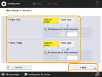 3 | Especifique el puerto al que aplicar IPSec. Pulse <Especificar por n.º de puerto> para utilizar los números de puerto al especificar los puertos a los que se aplica IPSec. Seleccione <Todos los puertos> para aplicar IPSec a todos los números de puerto. Para aplicar IPSec a un número de puerto concreto, pulse <Puerto único> e introduzca el número de puerto. Tras especificar los puertos, pulse <Aceptar>. Especifique el puerto de este equipo en <Puerto local>, y especifique el puerto del interlocutor de la comunicación en <Puerto remoto>. ![]() Pulse <Especificar por nombre servicio> para utilizar nombres de servicio al especificar los puertos a los que se aplica IPSec. Seleccione el servicio en la lista, pulse <Activ./Desac. servicio> para activarlo (<Sí>) y pulse <Aceptar>. ![]() | ||||||||||||||