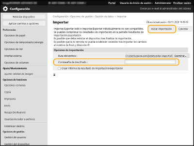 En [Contraseña de descifrado], introduzca la misma contraseña introducida al exportar los datos de configuración.