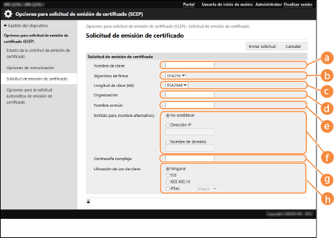 Puede enviarse una solicitud para emitir el certificado necesario para las claves generadas con el equipo a un servidor SCEP (Protocolo de inscripción de certificado simple) que gestione los certificados. Los certificados emitidos desde un servidor SCEP se registran automáticamente en el equipo. Se requieren privilegios de Administrator para enviar una solicitud para emitir un certificado.