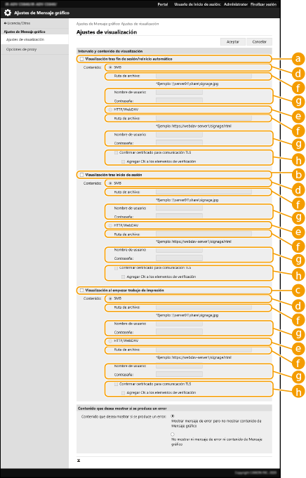 [Notificar al servicio de la información de inicio de sesión al mostrarse el contenido]Seleccione esta casilla de verificación para enviar la información del usuario (nombre de usuario y nombre de dominio) al servidor web cuando el usuario visualice el mensaje visual, e introduzca la ruta del servidor web.