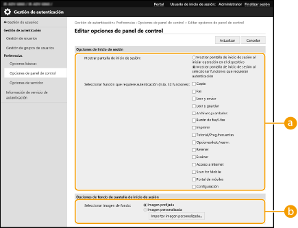 Puede configurar los métodos de inicio de sesión, los dispositivos de autenticación y otras funciones de autenticación a partir de su entorno de sistema y sus necesidades. También puede especificar cómo se muestra la pantalla de inicio de sesión.