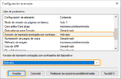 Seleccione [Activado] en [Función de impresión protegida con contraseña del dispositivo] y haga clic en [Aceptar].