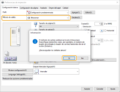 Seleccione [Almacenar] en [Método de salida] y haga clic en [Yes].