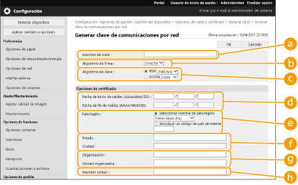 [Algoritmo de clave]Seleccione [RSA] o [ECDSA] como el algoritmo de generación de clave. Seleccione la longitud de la clave si se selecciona [RSA] y el tipo de clave si se selecciona [ECDSA]. En ambos casos, un valor superior proporciona una mayor seguridad, pero reduce la velocidad de procesamiento de la comunicación.
