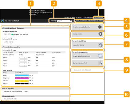 La página de portal que se muestra a continuación aparece al iniciar una sesión en la IU remota. En esta sección se describen los elementos que aparecen en la página de portal y las operaciones básicas.