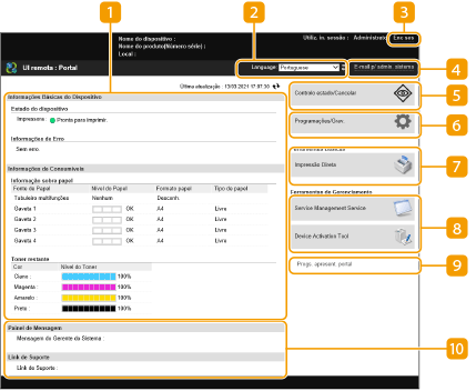 A página do portal mostrada abaixo é exibida quando você faz login na UI Remota. Esta seção descreve os itens exibidos na página do portal e nas operações básicas.