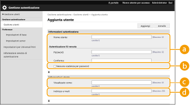 Ricerca di ID divisione non registratiSe si fa clic su [Controllo ID divisione non registrato...] nella schermata visualizzata al passo 4, è possibile trovare gli ID divisione che non sono registrati nella macchina, controllando quelli assegnati agli utenti e confrontandoli con quelli registrati nella macchina. Impostazioni batch per ID divisioneSe si fa clic su [Impostazioni batch per ID divisione...] nella schermata visualizzata al passo 4, è possibile creare nuovi ID divisione e applicare impostazioni per tutti gli utenti. Se il nome utente è costituito da sette numeri o meno, gli stessi numeri vengono assegnati al medesimo utente come ID divisione. Se la password dello stesso utente è registrata come numero di sette cifre o meno, viene impostata anche come PIN per tale ID divisione. Se il nome utente e la password non soddisfano le condizioni sopra specificate, viene assegnato un ID divisione a partire da 0000001, mentre come PIN viene impostato 0 (nessuno). Registrazione dell'ID divisione come Nome utenteSe si fa clic [Aggiunta utente usando ID divisione...] sullo schermo nel passaggio 4, come ID divisione viene registrato un nuovo utente con lo stesso nome. Quando viene utilizzata l'autenticazione da tastiera, l'autenticazione può essere effettuata utilizzando solamente una chiave numerica. |